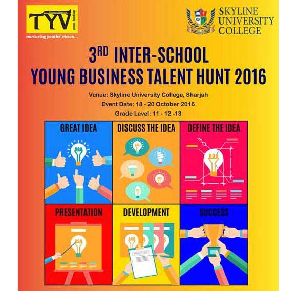 Sharjah, UAE, October 13, 2016: From the success of last year’s competition, Skyline University College (SUC) and The Young Vision Magazine (TYV) are back to set the stage for the third edition of the most anticipated Inter-School Young Business Talent Hunt on October 18-20, 2016. SUC and TYV have registered more than 290 teams joining in this year's competition. The three-day event is expecting the participation of 40 schools with an estimated number of 1,200 competing students from across the UAE. The objective of this competition is to discover potential young talents and to hone their skills by utilizing their creativity, knowledge, and inventiveness. Therefore, Inter-School Young Business Talent Hunt is a fundamental platform for the students’ educational and extra-curricular development. For SUC believes that encouraging the students and coming up with healthy competitions such as this will not just build their confidence but will nurture them on their journey to becoming entrepreneurs. Since the foundation of Inter-School Business Talent Hunt, the competition has become a podium for recognizing and uncovering young talents in the country. SUC and TYV’s goal is to be an instrument to the students by helping them grow as future professionals as well as inculcating the values of good sportsmanship, perseverance, and hard work. The Business Talent Hunt 2016 will have the following competitions: 1. Advertisement Design 2. Proposal for New Business 3. Proposal for New Mobile Application