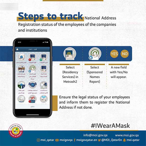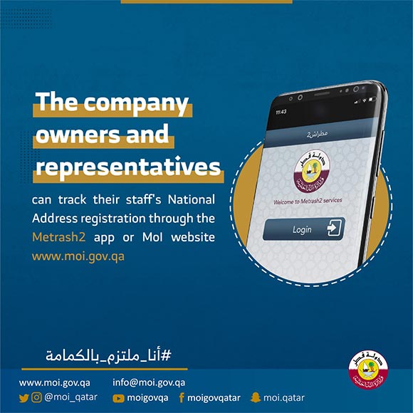 Qatar, May 31, 2021: The company owners and representatives can track their staff's national address registration through the Metrash2 app or Mol website www.moi.gov.qa